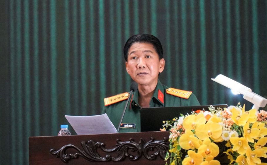 Đại tá Nguyễn Chí Linh, Phó Tham mưu trưởng Quân khu 9, phát biểu chỉ đạo trong lễ khai mạc. Ảnh: Phạm Trung.