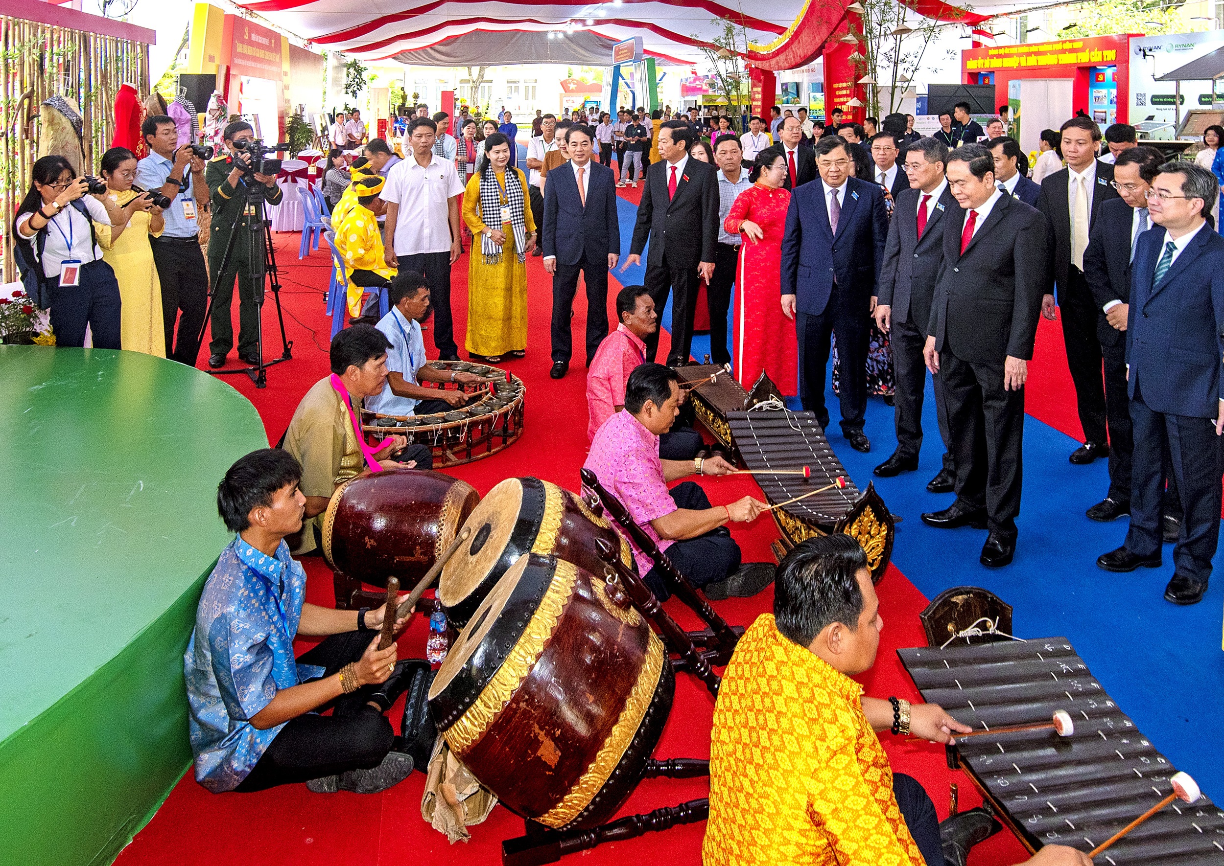 Chủ tịch Quốc hội Trần Thanh Mẫn giao lưu cùng các nghệ nhân biểu diễn nhạc ngũ âm của đồng bào dân tộc Khmer đang trình diễn chào mừng tại không gian triển lãm.