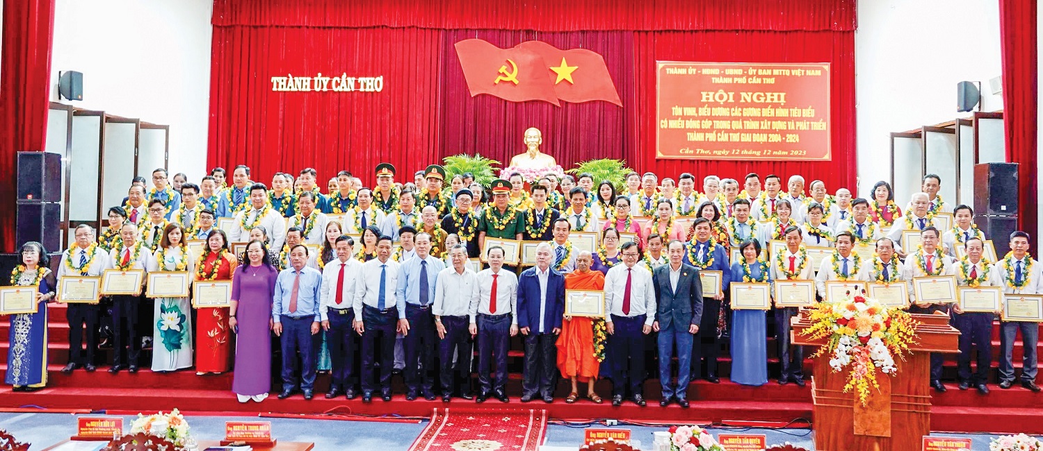Các đồng chí lãnh đạo thành phố chụp ảnh lưu niệm cùng các gương điển hình tiêu biểu có nhiều đóng góp trong quá trình xây dựng và phát triển TP Cần Thơ giai đoạn 2004-2024.