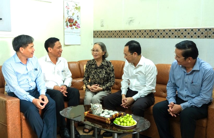Bí thư Thành ủy (thứ 2 từ phải qua) thăm Nhà giáo ưu tú Nguyễn Thị Minh Kính, nguyên Hiệu trưởng Trường THPT Châu Văn Liêm.