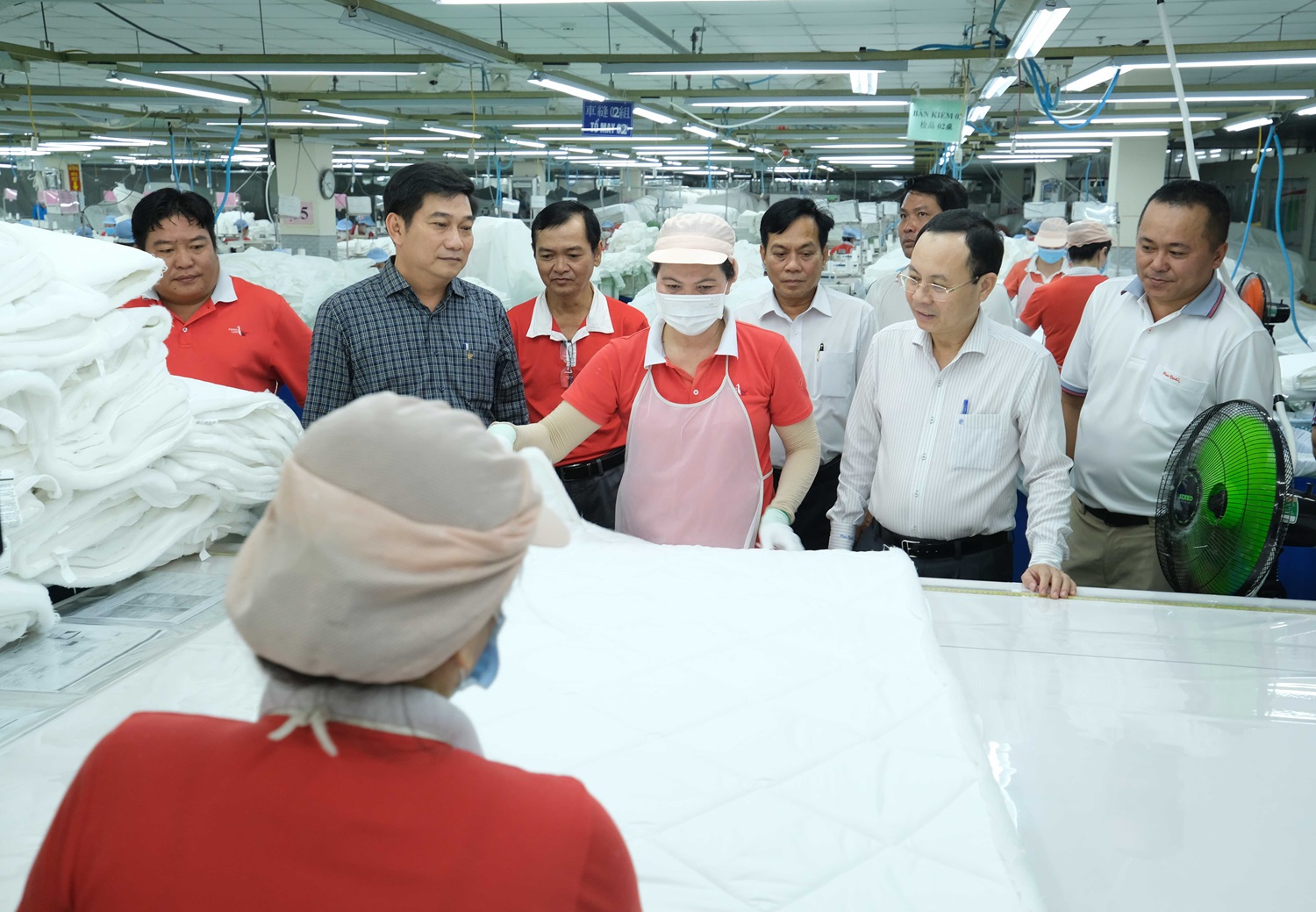 Đồng chí Bí thư Thành ủy Cần Thơ Nguyễn Văn Hiếu tham quan phân xưởng sản xuất lông vũ của Công ty TNHH Kwong Lung Meko.