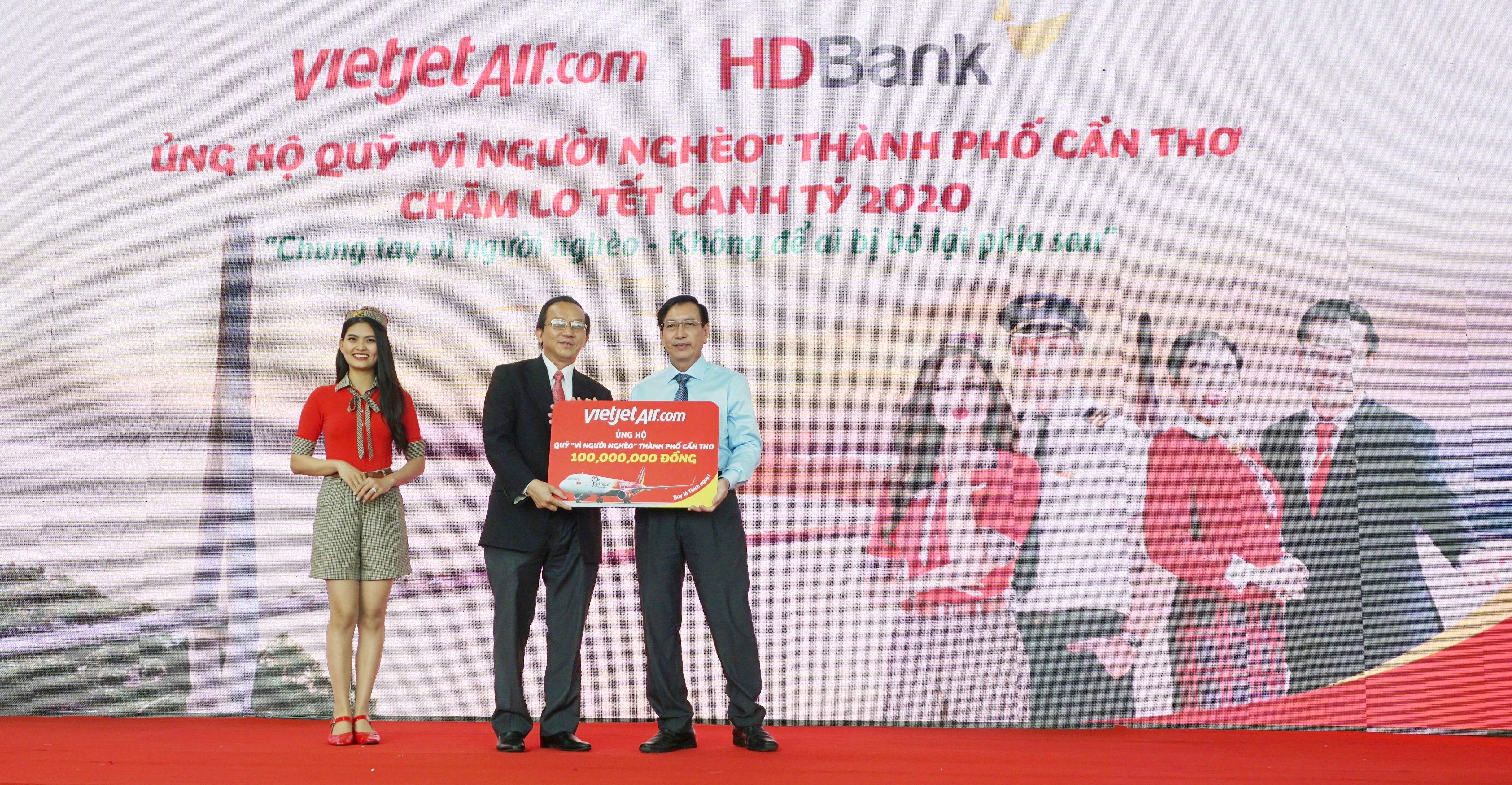 Tại lễ khai trương, Vietjet Air và Ngân hàng Thương mại cổ phần Phát triển TP Hồ Chí Minh (HDBank) trao tặng 200 triệu đồng đến Quỹ Vì người nghèo TP Cần Thơ. Ảnh Nhật Hy.