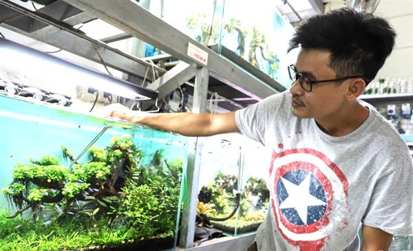 Anh Lư Hoàng Hiệp tỉ mỉ chăm sóc, vệ sinh hồ thủy sinh.