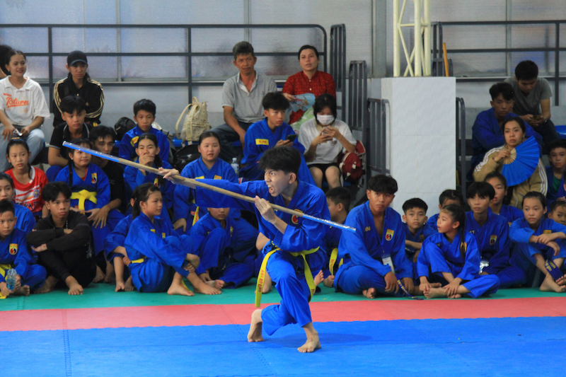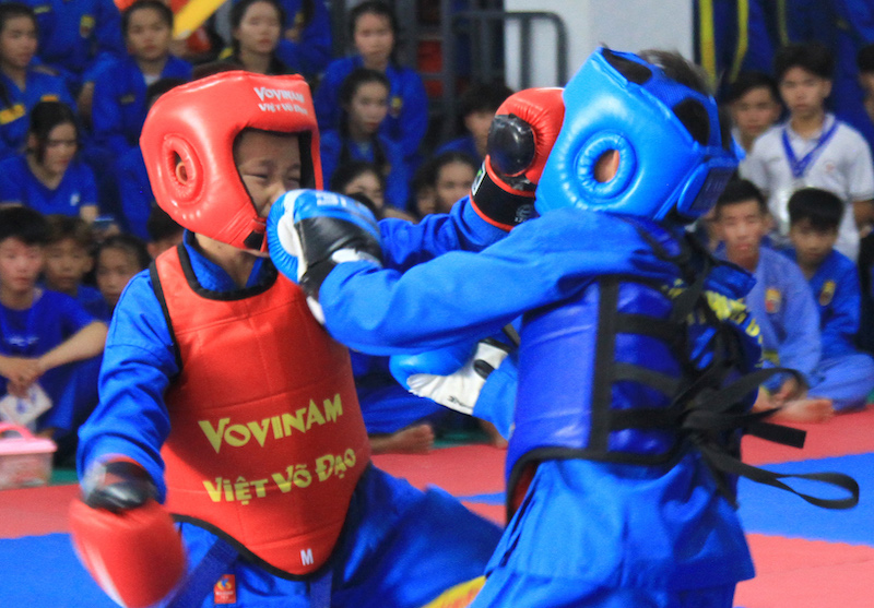 Thi đấu đối kháng môn Vovinam giữa hai võ sinh cấp tiểu học.
