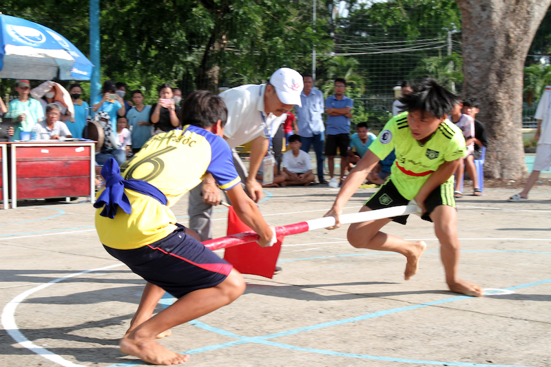 Trận chung kết nội dung 56kg môn đẩy gậy giữa hai VĐV cấp THCS của quận Ninh Kiều (phải) và huyện Cờ Đỏ diễn ra căng thẳng, với chiến thắng nhọc nhằn 2-1 của VĐV quận Ninh Kiều sau 3 hiệp đấu.