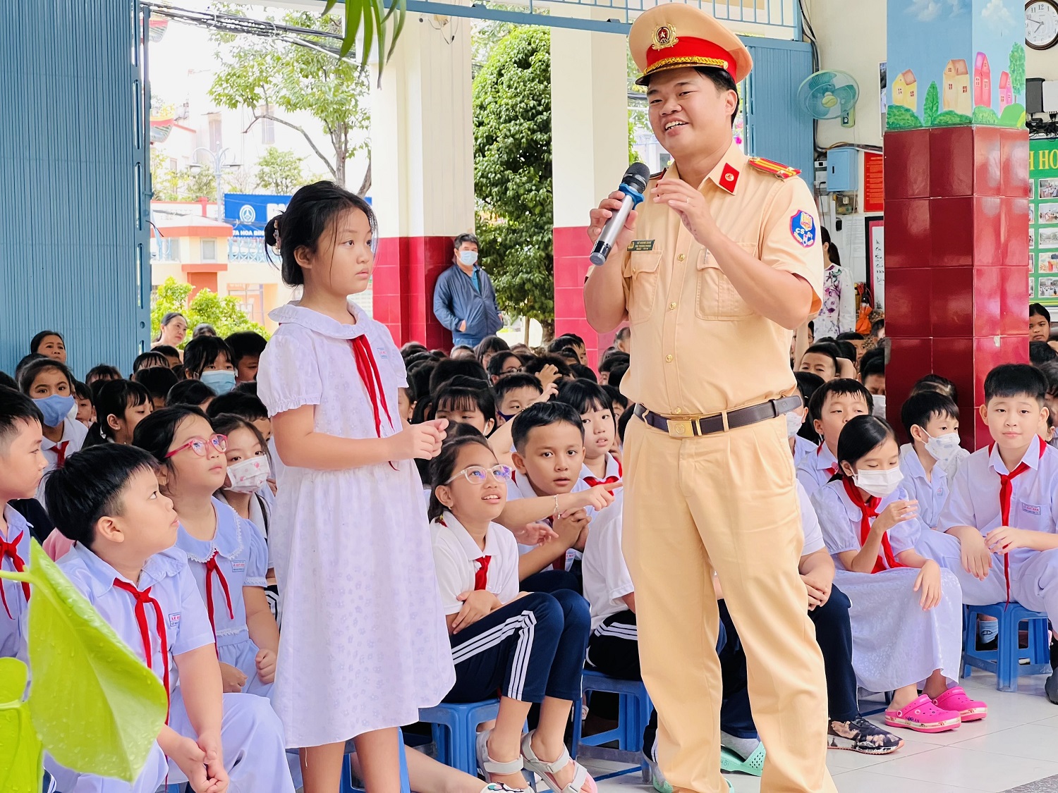 Trung tá Võ Hoàng Sang, Phó Trưởng Phòng Cảnh sát giao thông (CATP Cần Thơ) hướng dẫn học sinh tham gia giao thông an toàn tại buổi tuyên truyền.