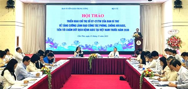 Ban Tuyên giáo Trung ương phối hợp Bộ Y tế tổ chức Hội thảo Triển khai Chỉ thị số 07-CT/TW “Về tăng cường lãnh đạo công tác phòng, chống HIV/AIDS, tiến tới chấm dứt dịch bệnh AIDS tại Việt Nam trước năm 2030” tại thành phố Cần Thơ ngày 21/11/2023. Ảnh: Ngọc Quy.