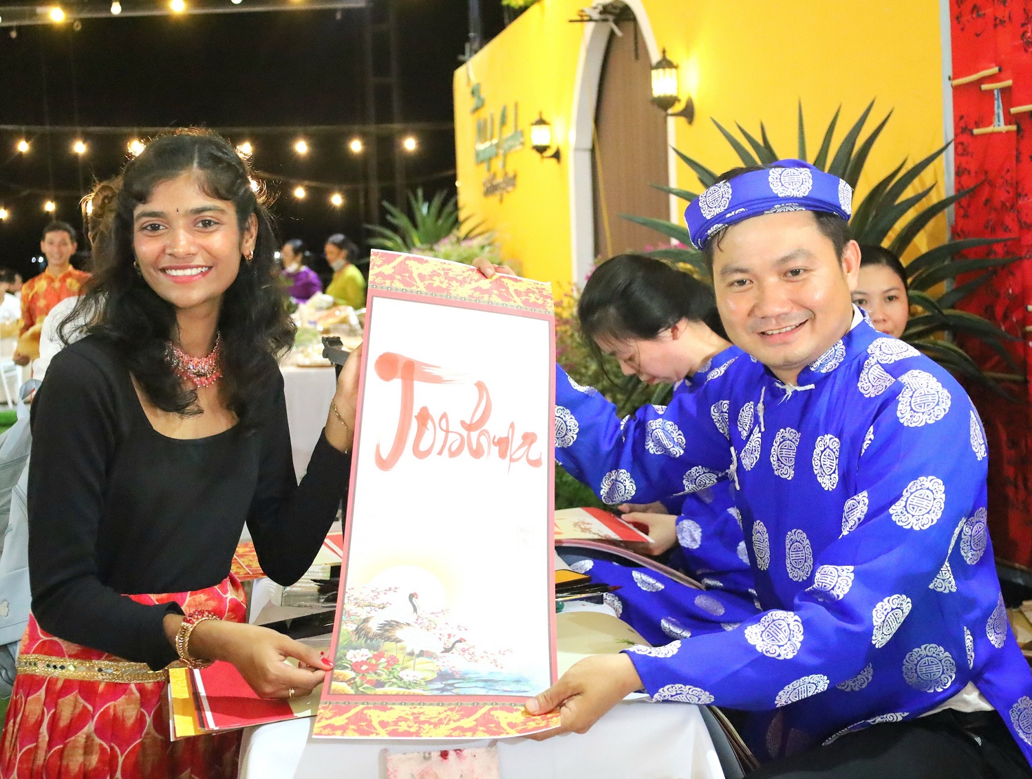Bạn bè quốc tế vui thích thưởng thức buổi tiệc rộn ràng với các tiết mục văn nghệ dân gian và thưởng thức các món ăn đặc trưng miền Tây. Nhiều bạn trẻ thích thú xin chữ thư pháp.