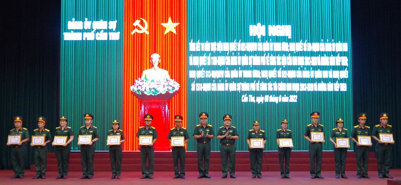 Đại tá Chiêm Thống Nhất, Ủy viên Ban Thường vụ Thành ủy, Chỉ huy trưởng Bộ CHQS thành phố, Đại tá Phạm Ngọc Quang, Thành ủy viên, Chính ủy Bộ CHQS thành phố tặng giấy khen cho tập thể, cá nhân có thành tích tiêu biểu trong thực hiện nghị quyết 623 của Quân ủy Trung ương.
