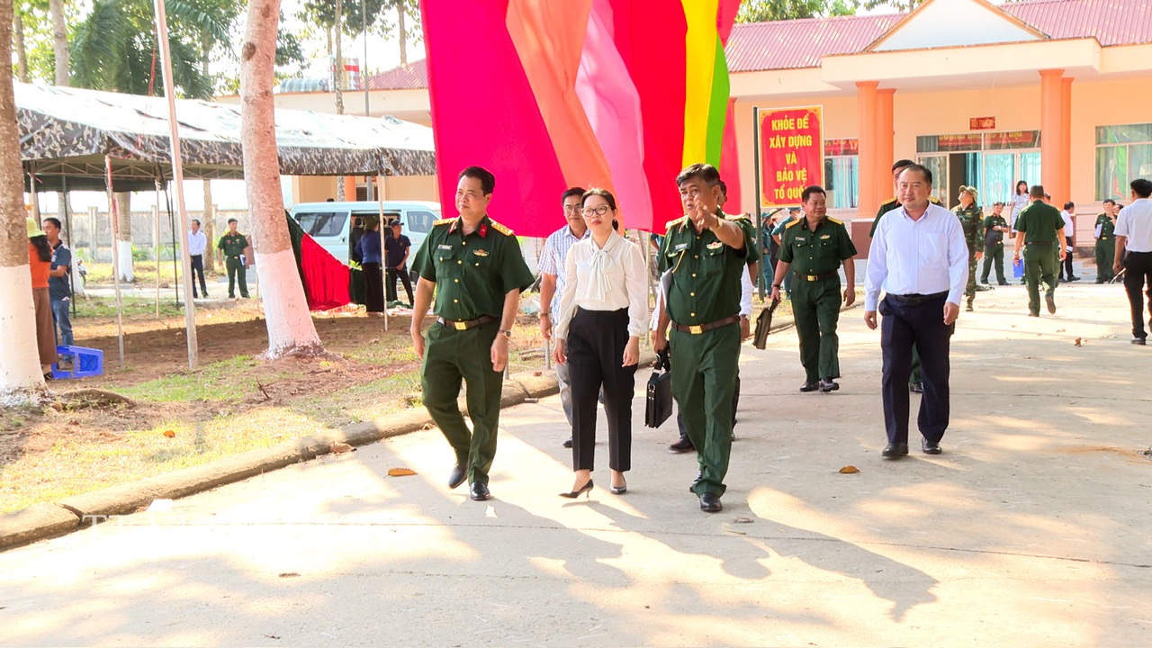 Thượng tá Huỳnh Văn Hung, Uỷ viên Ban Thường vụ Thành ủy, Chỉ huy trưởng Bộ Chỉ huy Quân sự thành phố Cần Thơ kiểm tra công tác chuẩn bị Hội trại tòng quân tại huyện Thới Lai. Ảnh: Cẩm Tú.