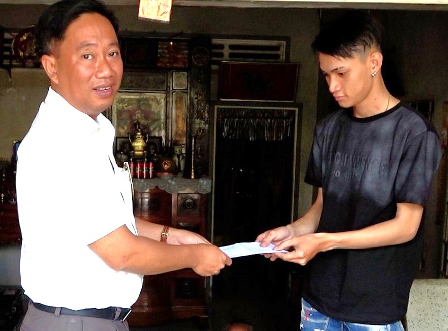 Đồng chí Nguyễn Thị Nữ, Phó Bí thư Thường trực Quận ủy Bình Thủy trao quà cho thanh niên Kha Nhật Tiến. Ảnh: Kiều Nương.