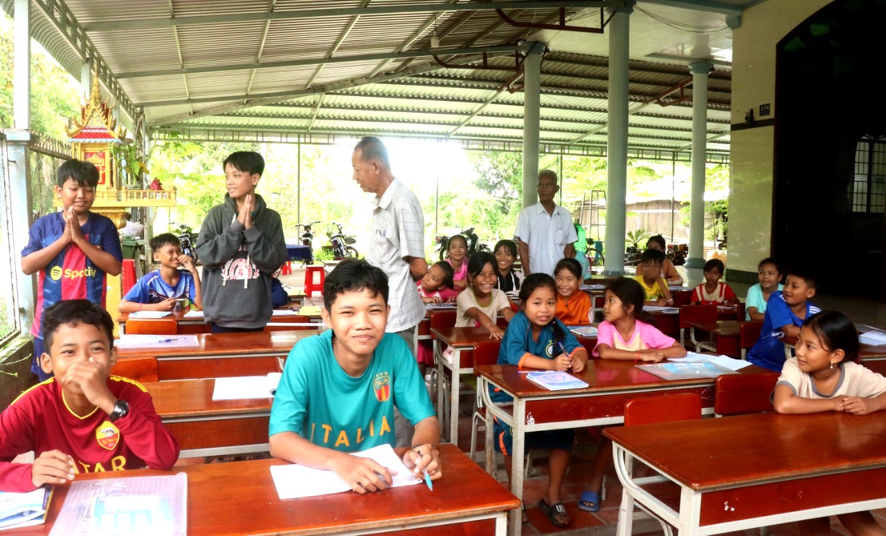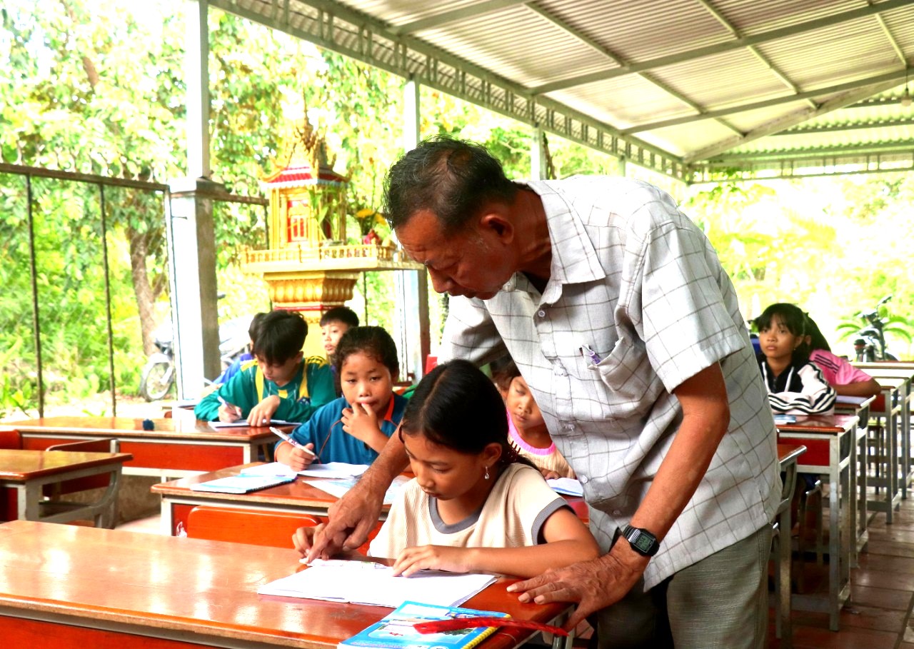 Hôm chúng tôi ghé lớp học là ngày ông Thạch Diễm, 60 tuổi đứng lớp. Dù lớn tuổi và bận việc đồng án nhưng ông Thạch Diễm vẫn sắp xếp thời gian, mỗi tháng 2 tuần đến lớp dạy đọc, dạy viết cho "bọn trẻ". Theo ông Thạch Diễm, con em người Khmer ở ấp đa phần đều nói thạo tiếng mẹ đẻ (tiếng Khmer) nhưng không biết chữ, không biết viết.