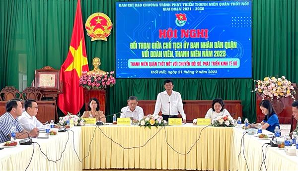 Sáng ngày 21/9/2023, UBND quận Thốt Nốt phối hợp tổ chức hội nghiệ đối thoại giữa Chủ tịch UBND quận và ngành chức năng với đoàn viên, thanh niên năm 2023 với chủ đề “Thanh niên quận Thốt Nốt với chuyển đổi số, phát triển kinh tế số”. Ông Nguyễn Ngọc Hiệp, Phó Bí thư Thường trực Quận ủy Thốt Nốt; ông Võ Văn Tân, Phó Bí thư Quận ủy, Chủ tịch UBND quận Thốt Nốt dự và chủ trì buổi đối thoại.