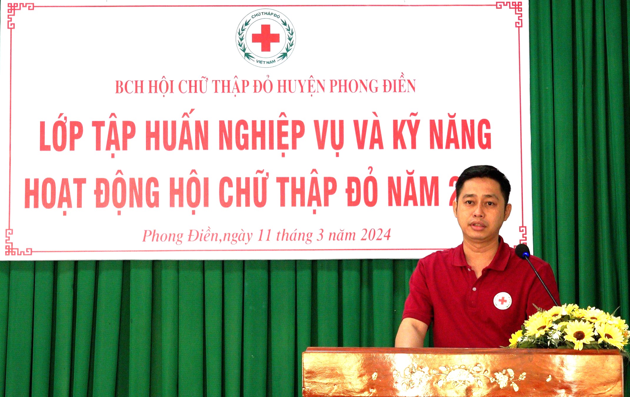 Ông Tạ Quang Đức, Chủ tịch Hội Chữ thập đỏ huyện Phong Điền phát biểu khai giảng lớp tập huấn.