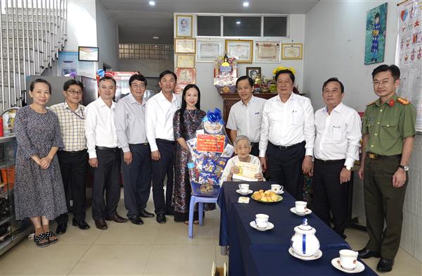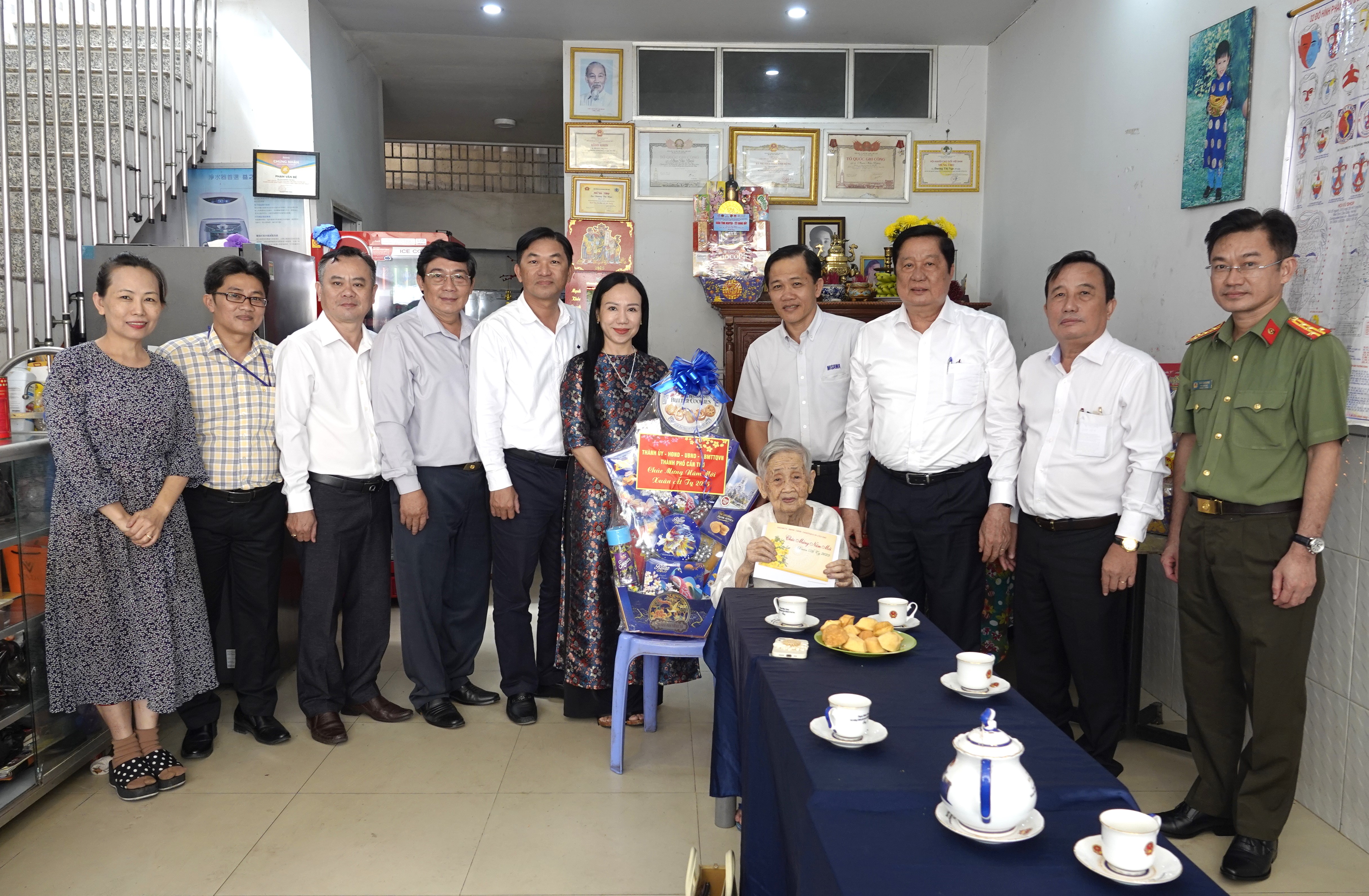 Đồng chí Phạm Văn Hiểu cùng các thành viên trong đoàn và lãnh đạo quận Ninh Kiều đến chúc Tết, tặng quà Mẹ Việt Nam Anh hùng Dương Thị Nga và Anh hùng Lực lượng Vũ trang Nguyễn Xuân Xinh ở quận Ninh Kiều.