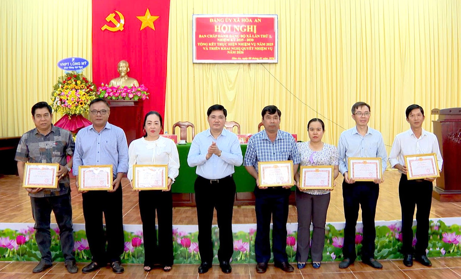 Dịp này, Đảng ủy xã Hòa An tặng giấy khen cho 7 tập thể và 68 cá nhân hoàn thành xuất sắc nhiệm vụ năm 2025.