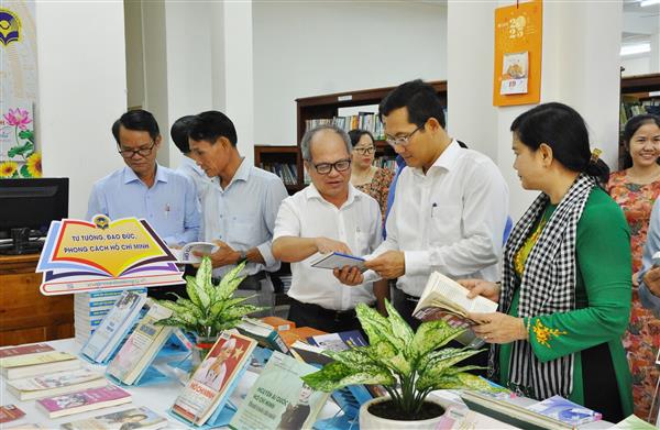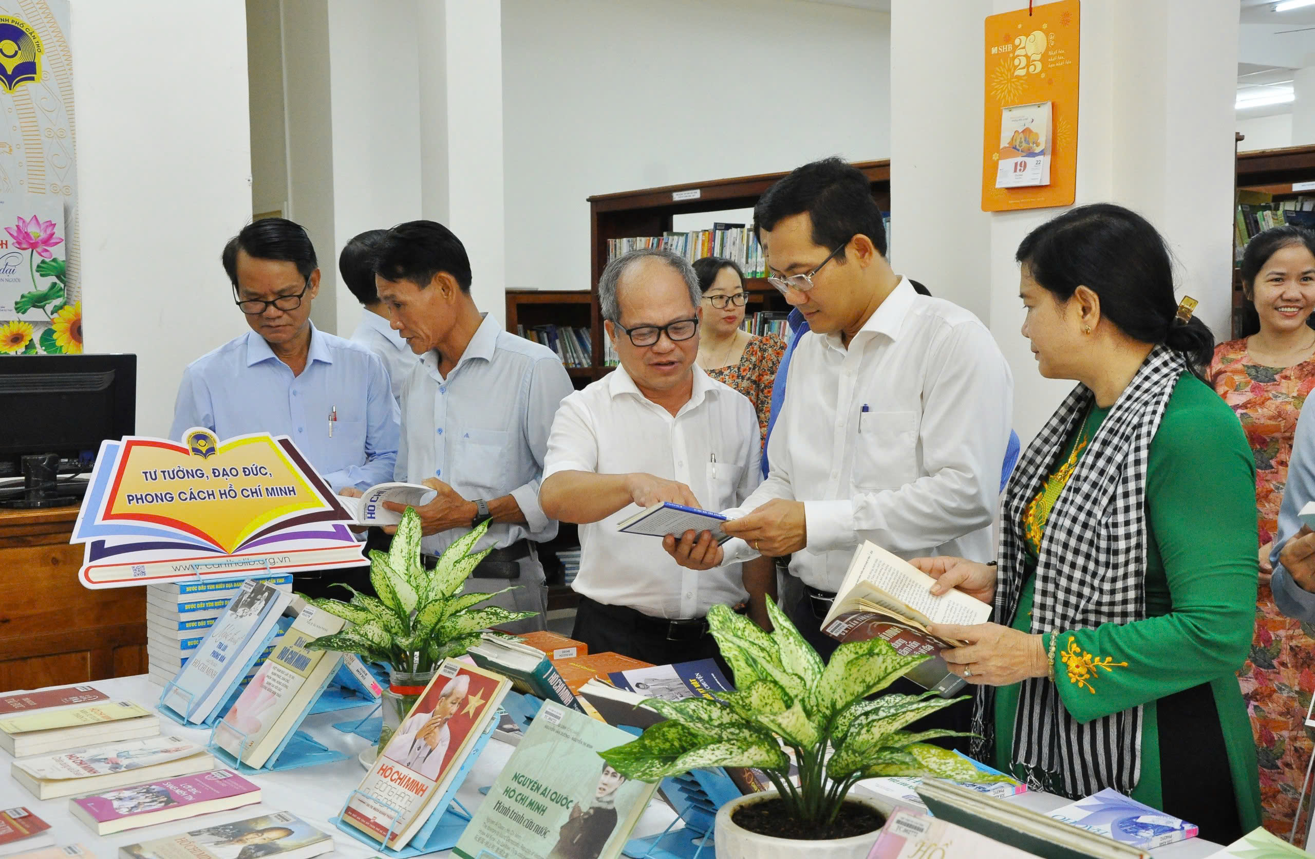 Các đại biểu tham quan không gian triển lãm sách chuyên đề “Hồ Chí Minh - Vĩ đại một con người” tại Thư viện thành phố Cần Thơ.