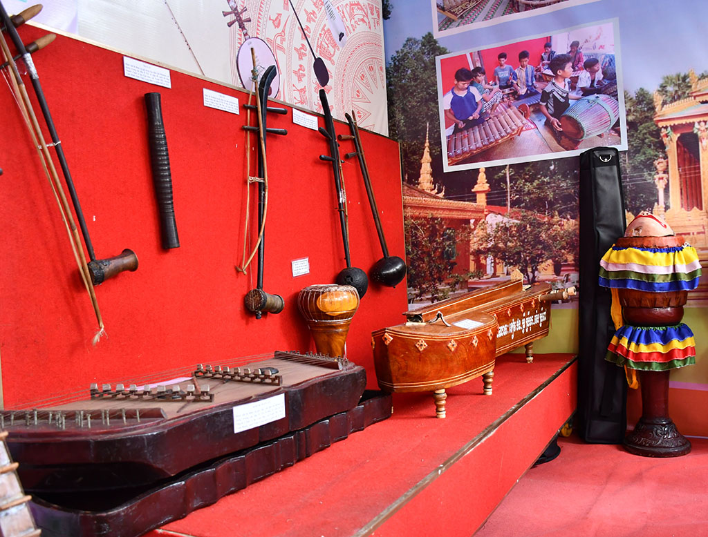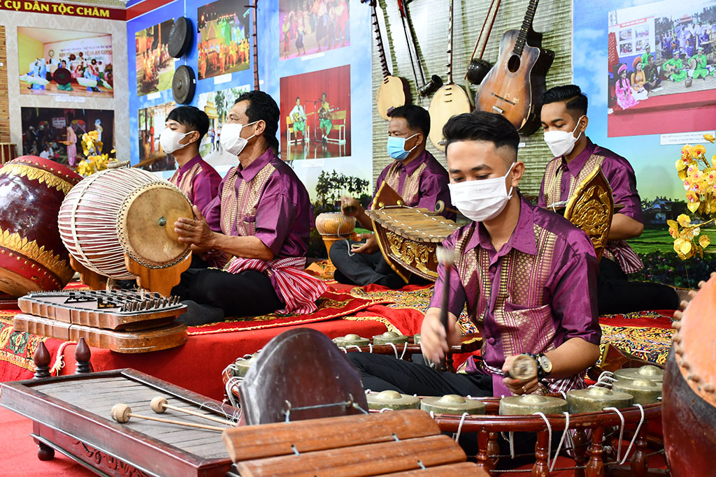 Nghệ nhân đến từ tỉnh An Giang trình tấu nhạc ngũ âm của đồng bào Khmer tại triển lãm.