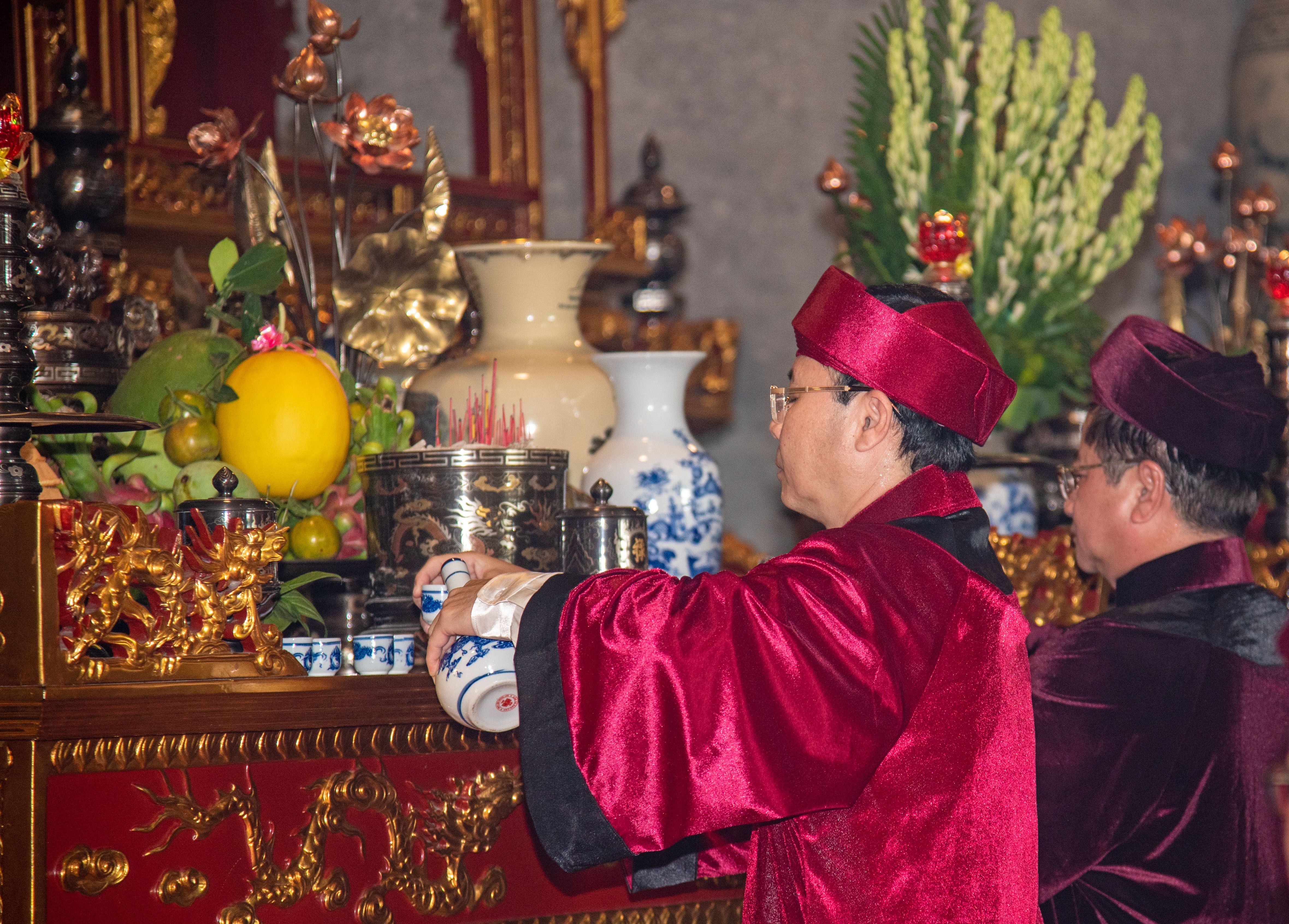 Đồng chí Nguyễn Văn Hiếu và Trần Việt Trường thực hiện nghi thức dâng rượu lên Quốc Tổ.
