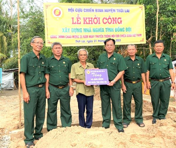 Hội Cựu chiến binh (CCB) huyện Thới Lai vừa tiến hành khởi công xây dựng nhà Nghĩa tình đồng đội trị giá 50 triệu đồng cho CCB Lê Văn Hùng, ở ấp Thới Phước 1, xã Tân Thạnh. CCB Lê Văn Hùng thuộc diện hộ có hoàn khó khăn của địa phương, không có ruộng đất, sinh sống bằng nghề làm thuê… Dự kiến căn nhà của CCB Lê Văn Hùng sẽ hoàn thành trước Tết Nguyên đán năm 2024.