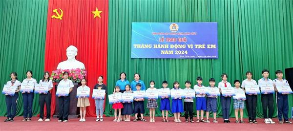 Trao quà cho học sinh là con công đoàn viên có hoàn cảnh khó khăn vượt khó học giỏi nhân Tháng hành động vì trẻ em năm 2024.